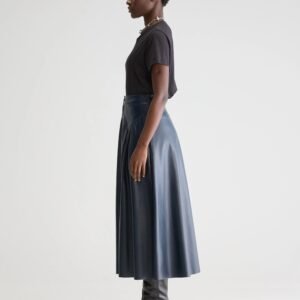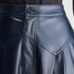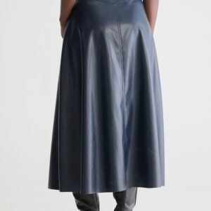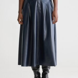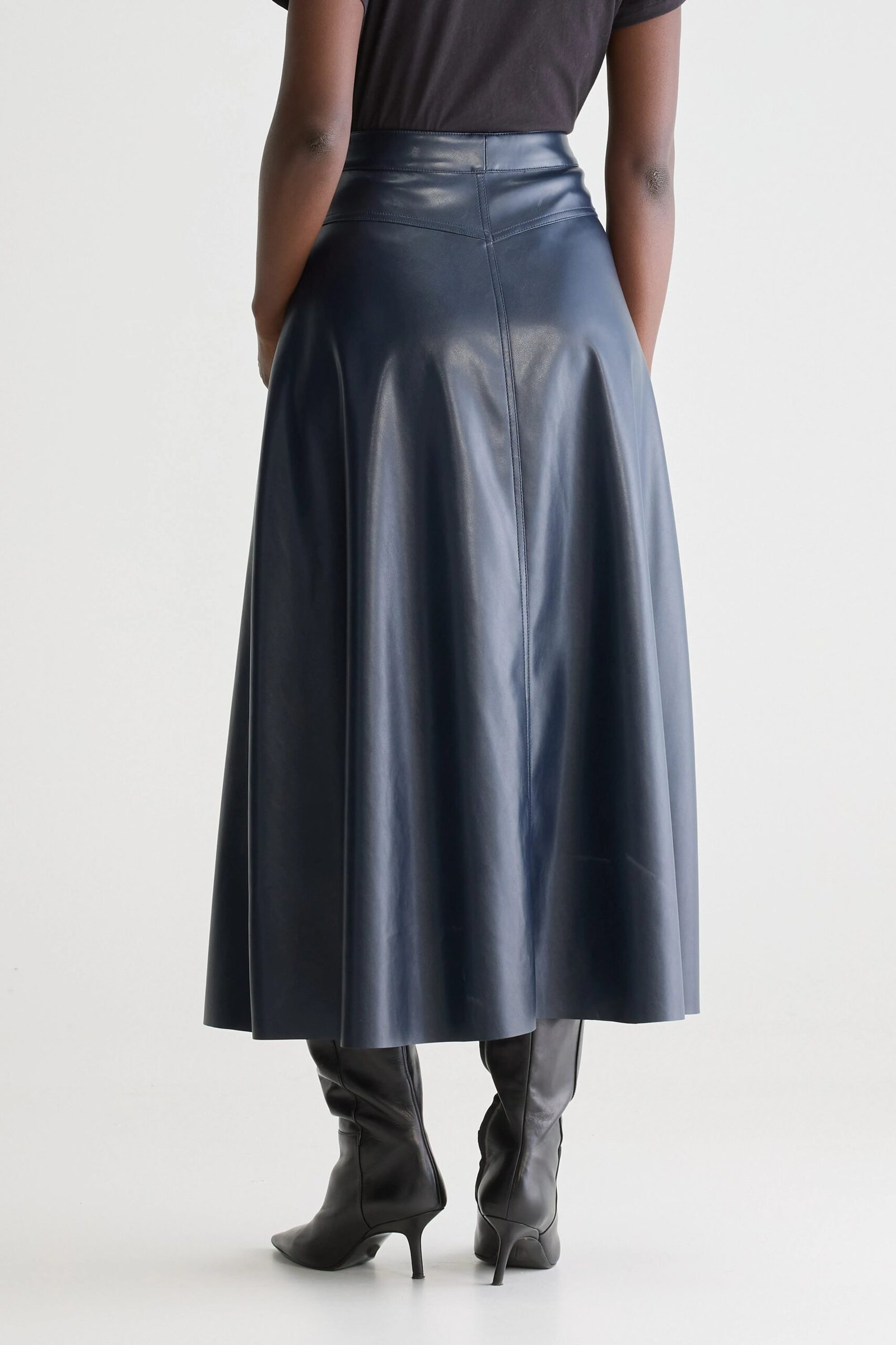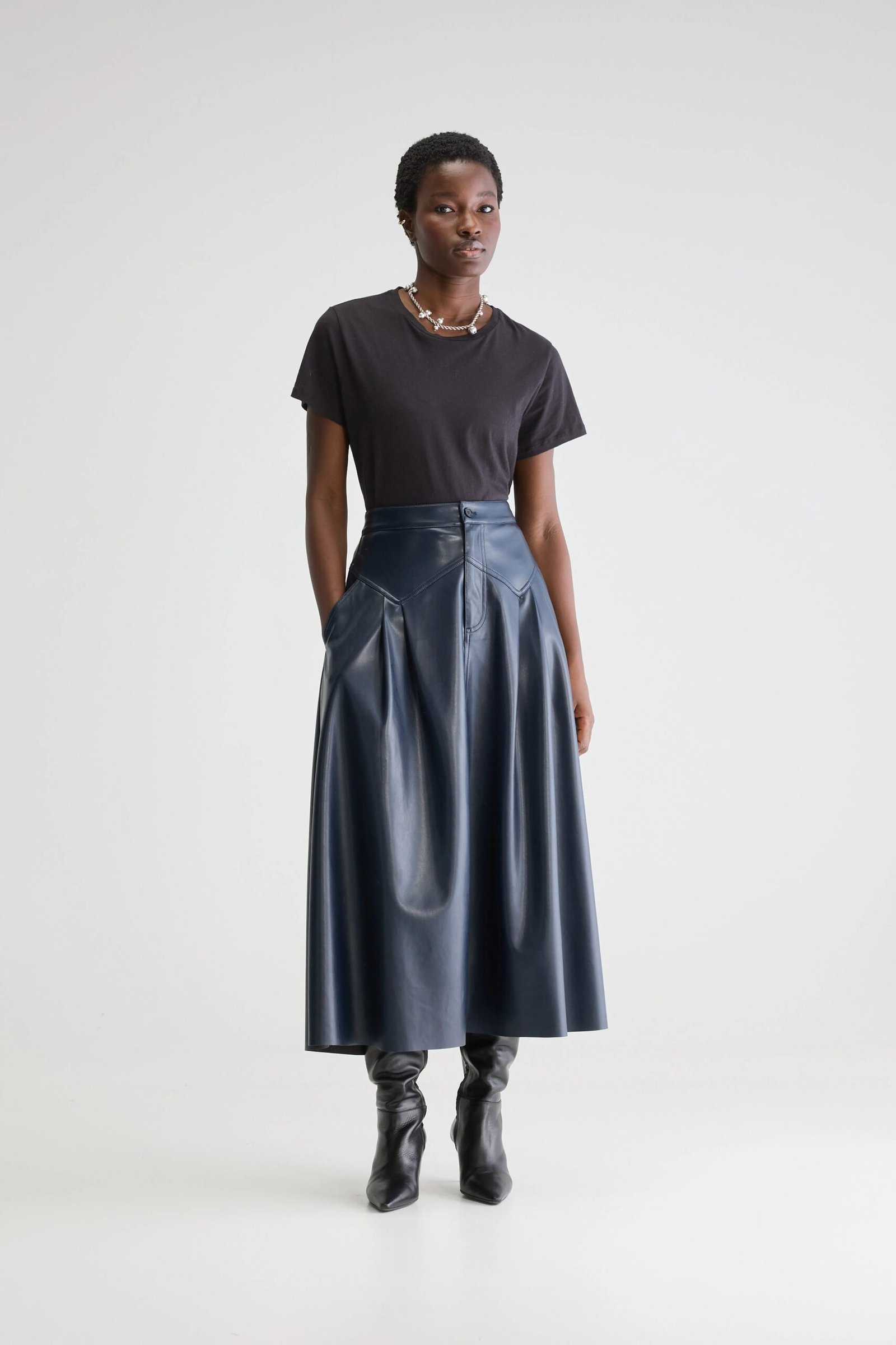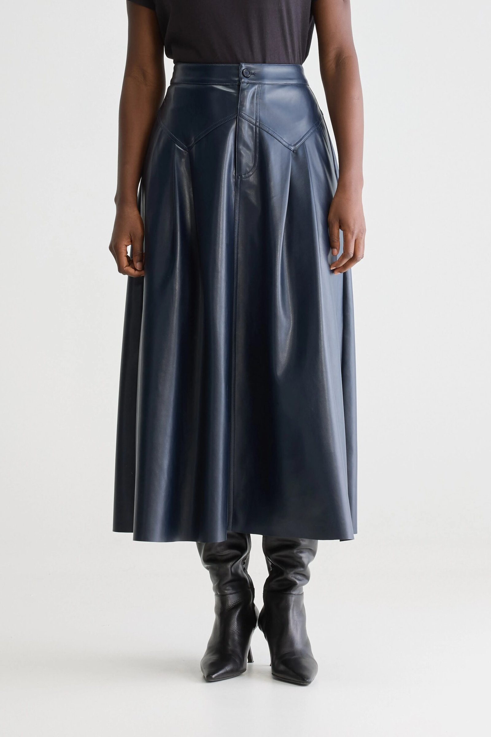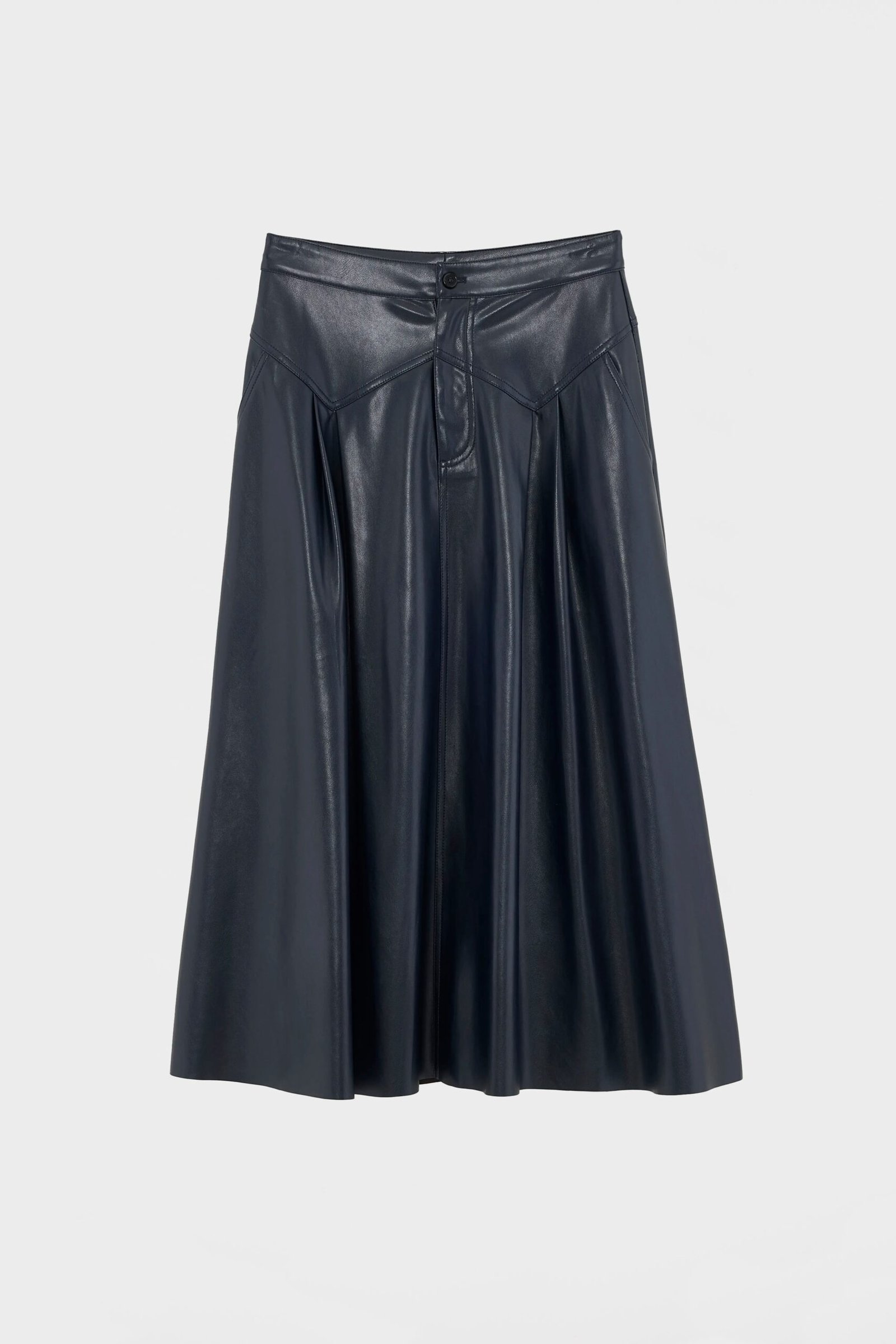 Flared mid skirt with Western-inspired details on the waist and front pleats made from dark blue fake leather.
