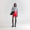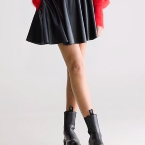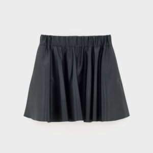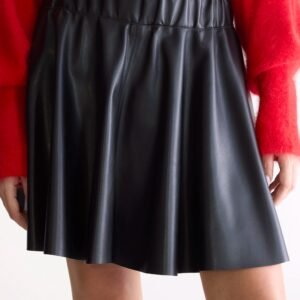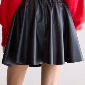 Black mini skirt in a suptle faux leather with a elasticated waistband and voluminous silouhette.